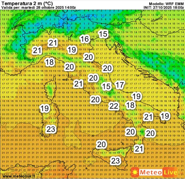Temperature in lieve aumento sull’Italia. Punte di 23° nel sud della Sardegna e sulla Sicilia. Valori localmente oltre i 20° anche su alcune aree della Valpadana e del Tirreno.