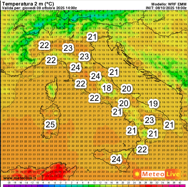 25° sono attesi in Sardegna, 24° su Sicilia, Toscana ed Umbria. Temperature in aumento anche al sud stante l’attenuazione delle correnti settentrionali. Valori comunque molto gradevoli su tutta l’Italia.