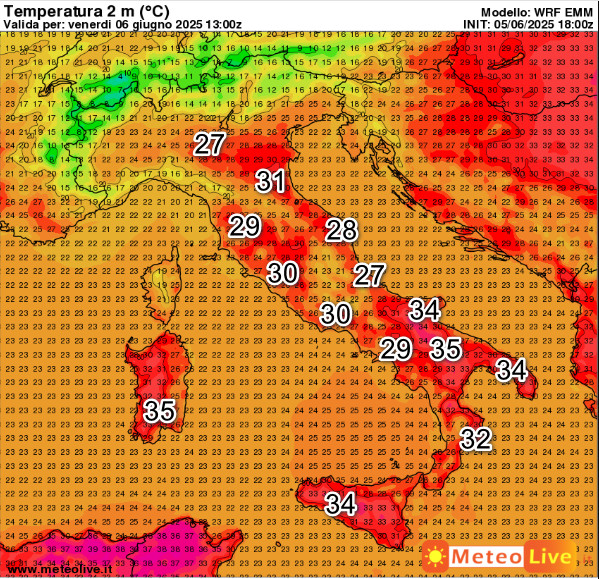Queste sono le temperature attese in Italia alle ore 15 di venerdi 6 giugno – si consiglia di ingrandire la mappa per avere un migliore riscontro visivo: