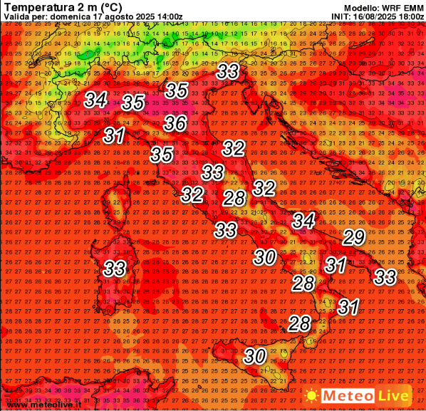 Le TEMPERATURE previste in Italia alle ore 16 di domenica 17 agosto