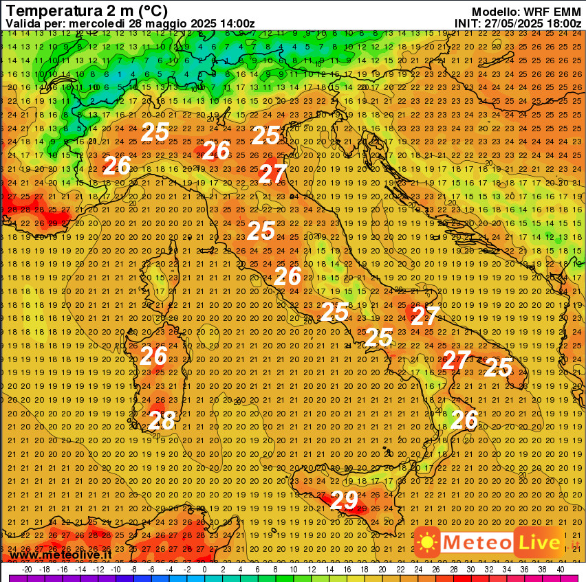 Punte di 29° nel sud della Sicilia, 28° sulla Sardegna meridionale, 27° su Lucania, Puglia e Romagna, 25-26° in Valpadana e zone interne di Toscana e Lazio.