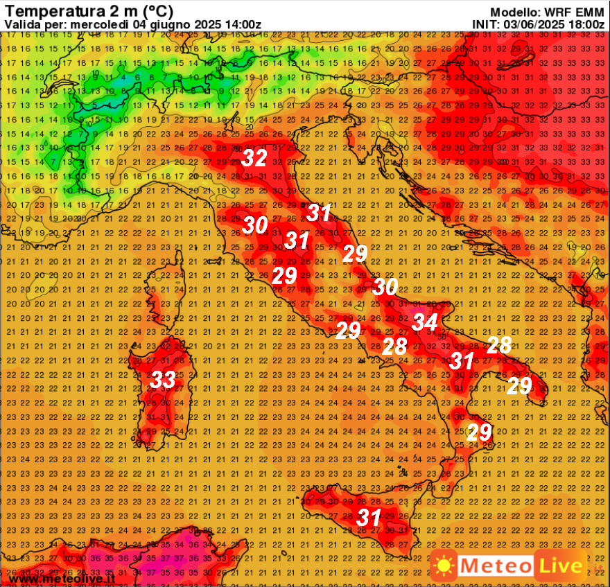 Clima caldo al centro-sud e sull’Emilia Romagna: punte di 34° nel Foggiano, 33° in Sardegna, 32° sulla Romagna e 31° tra Marche, Toscana e Lazio. Valori più freschi invece al nord-ovest.