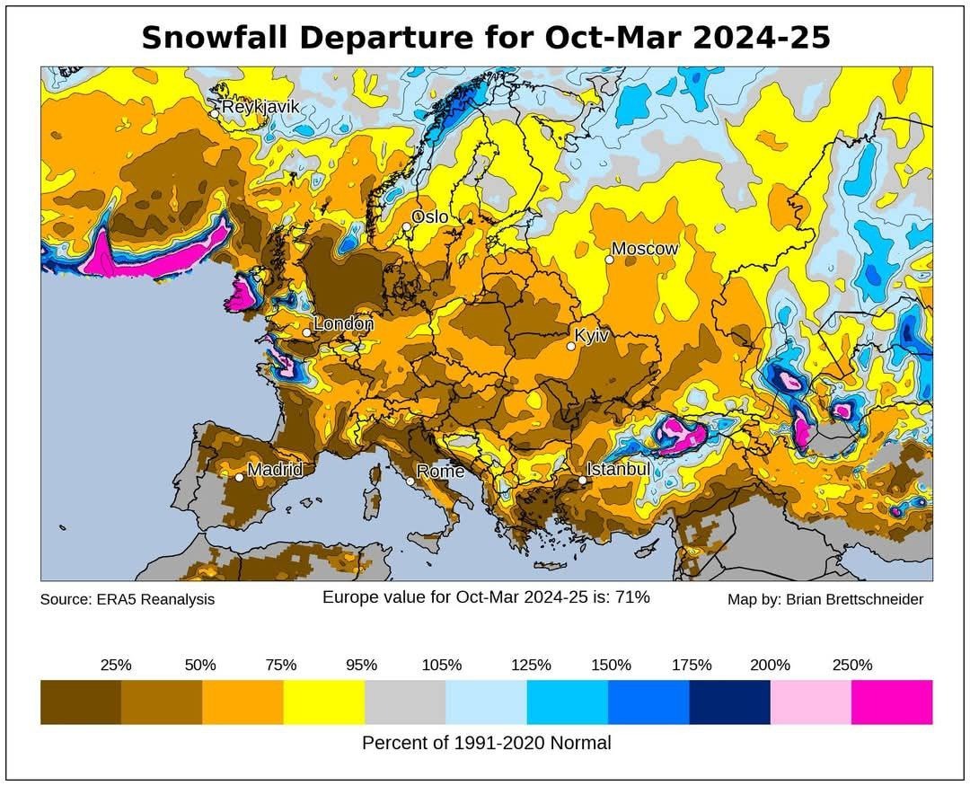 Questa è la mappa della percentuale di nevosità in Europa (e non solo) nel lasso temporale compreso tra ottobre 2024 e marzo 2025: