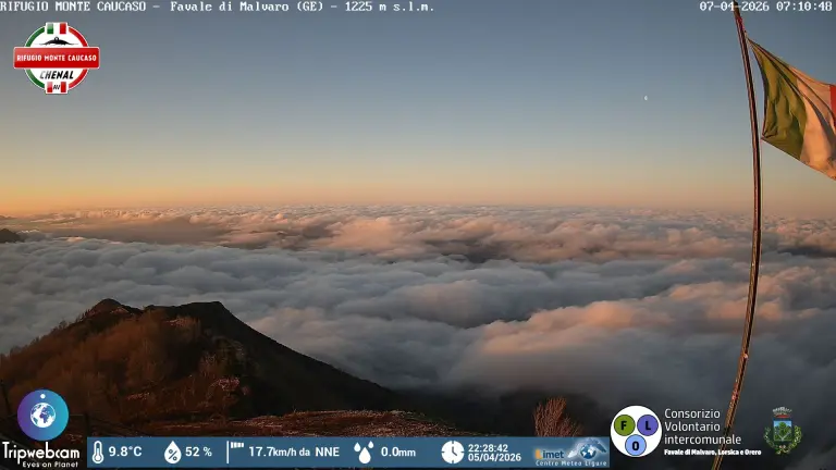 Mentre le coste liguri sono immerse nelle nubi basse (la classica Maccaja), sopra i 1000 metri questa mattina lo spettacolo è mozzafiato. La webcam del Monte Caucaso (1225 metri), cattura uno spettacolo incredibile.