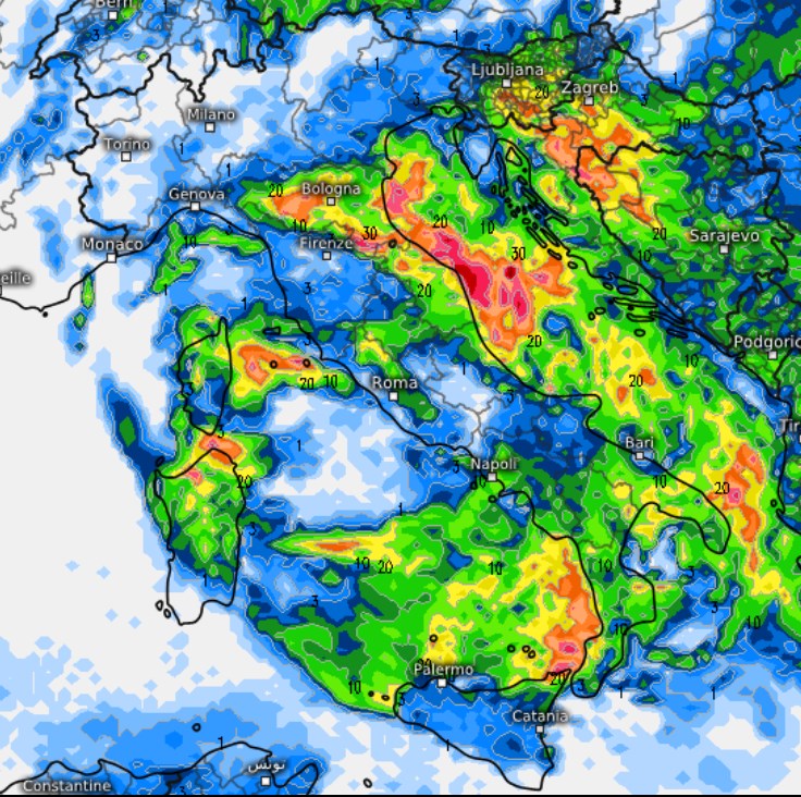 Le zone più coinvolte, analizzando anche altri modelli di previsione, potrebbero risultare le province fra Parma e Rimini in Emilia e la provincia di Pesaro, Ancona e Ascoli Piceno, specie nei primi rilievi più vicini alla costa. Le piogge più abbondanti si verificheranno con maggiore probabilità fra la mattinata di lunedì e la mattinata di martedì.