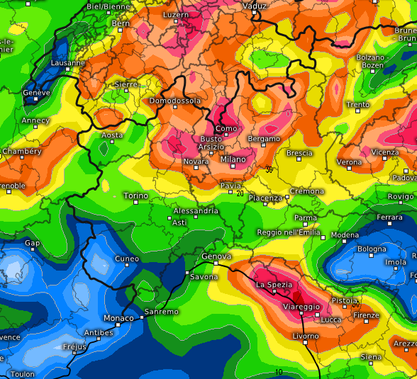 Si notano (ma non è una novità) accumuli rilevanti su alta Lombardia, Ossola, Veneto (ma anche Friuli che qui non è riportato), Spezzino, Viareggino, Livornese, Aretino, a testimonianza di un guasto serio che potrebbe portare anche nevicate importanti sulle Alpi oltre i 1800m.