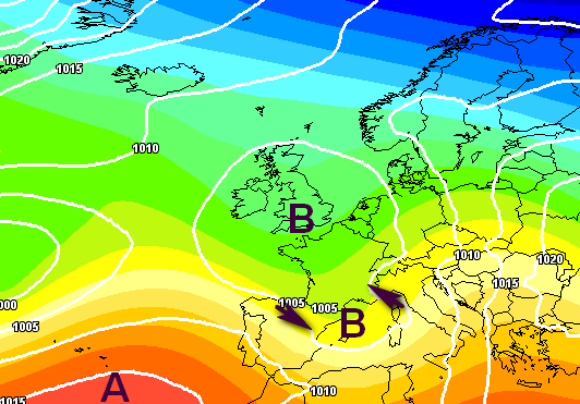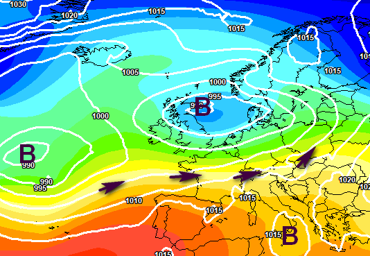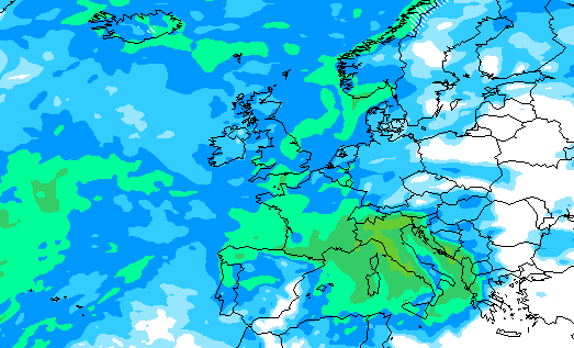 Lo si vede molto bene dalla mappa qui sopra e lascia perfettamente intuire quali ne saranno le conseguenze precipitative che vi mostriamo su scala europea: