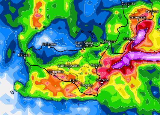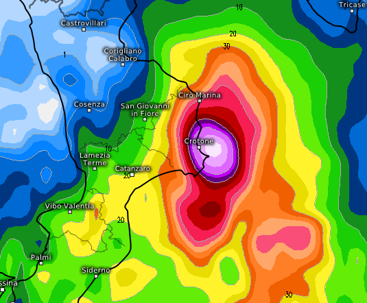 Le città più colpite in Sicilia dovrebbero risultare quelle di Agrigento, Gela, Ragusa, Siracusa e Catania, mentre in Calabria il settore della Calabria jonica potrebbe risentire a tratti di forti nubifragi che si scateneranno in mare aperto, ma che potrebbero raggiungere la linea di costa soprattutto tra Siderno e il Catanzarese, ma anche il Crotonese. Addirittura un modello prevede un forte nubifragio su Crotone, come si vede dalla mappa che segue: