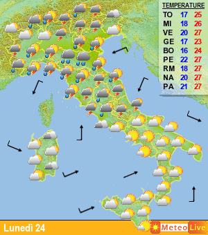 Le previsioni per le prossime ore indicano un graduale ma temporaneo miglioramento fra domenica sera e la mattinata di lunedì delle condizioni meteorologiche su Alpi, Prealpi e alte pianure del nord Italia ma anche lunedì 24 giugno il tempo rimarrà molto instabile non solo su quasi tutto il nord Italia, ma anche su gran parte del centro. Particolarmente colpita sarà l’Emilia, con piogge molto abbondanti.