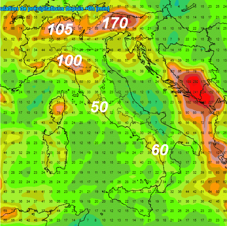Punte di 170 mm sul Friuli, 105 mm sulla fascia alpina centrale, 100 mm sull’Appennino Ligure, 60 mm nel Cilento e 50 mm sull’alto Lazio.