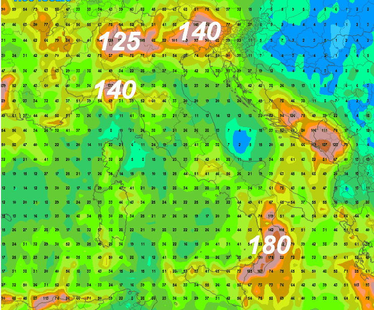 Punte di 180 mm sulla Calabria Ionica, 140 mm sulle Alpi orientali e la Liguria centrale, 125 mm sulla fascia prealpina centrale.