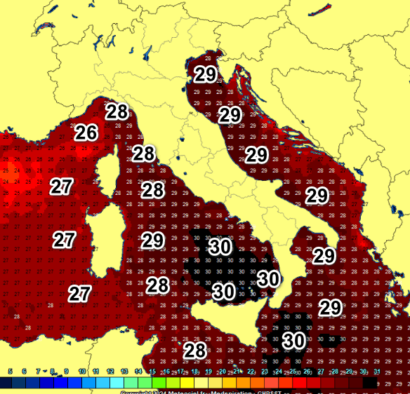 Notiamo 30° diffusi sul basso Tirreno e su parte dello Ionio, 29° in Adriatico e 28° su molte aree del Tirreno e del Mar Ligure. Relativamente più fresche le acque ad ovest della Corsica e della Sardegna con 26-27°.