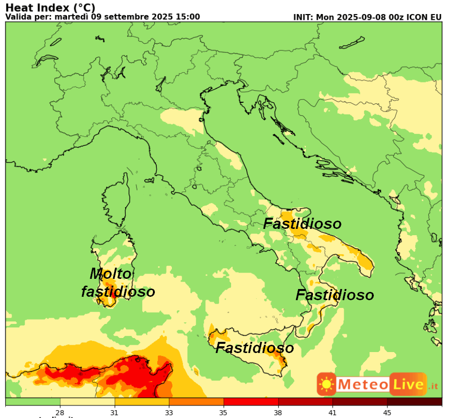 Caldo MOLTO FASTIDIOSO nel sud della Sardegna. Caldo FASTIDIOSO o MOLTOI FASTIDIOSO in Sicilia. Caldo FASTIDIOSO anche sulla Calabria Ionica e sulla Puglia, per il resto avremo caldo POCO FASTIDIOSO o SOPPORTABILE.