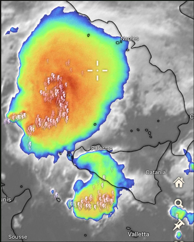 Il sistema temporalesco agisce al momento in mare aperto, con piogge torrenziali ed intense fulminazioni. Si avvicinerà alla Sicilia settentrionale nelle prossime ore per poi spostarsi sulla Calabria. Attenzione ai nubifragi ed agli allagamenti!