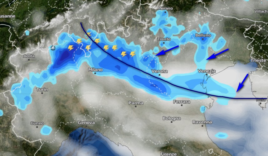 Una veloce linea temporalesca, peraltro non molto organizzata, attraverserà parte della Valpadana tra la tarda serata di mercoledì 29 e l’alba di giovedì 30 aprile, colpendo dapprima il Triveneto e l’arco alpino centrale, poi la pianura lombarda ed emiliana, prima di scivolare lungo il versante adriatico.