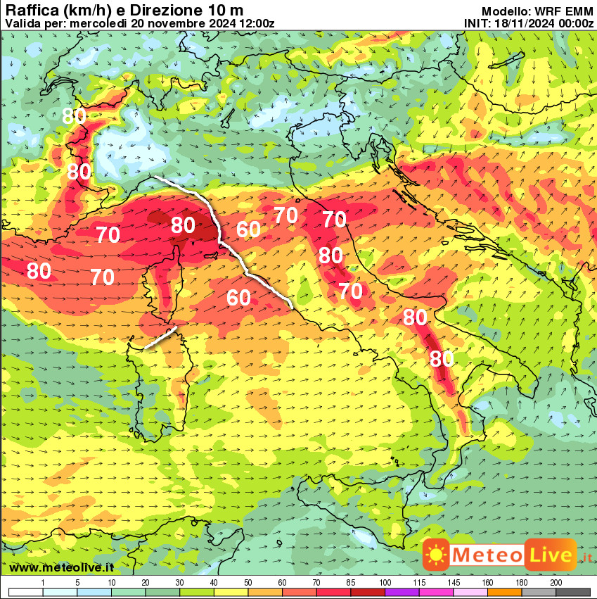 Raffiche a 70-80km/h saranno possibili sul Mar Ligure, le Alpi occidentali (con bufere di neve) e sui crinali dell’Appennino centro-meridionale; 60-70km/h tra il medio Adriatico, l’alto Tirreno e la Corsica. Avremo mareggiate nei tratti di costa segnati in bianco, ovvero la Riviera di Levante, la Toscana, l’alto Lazio e la Sardegna nord-orientale. Prudenza nella navigazione!