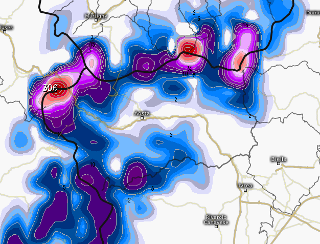 in Piemonte: alta Val di Susa, alta Val Germanasca, alta Val Pellice, alta Val Sangone, alta Formazza, alta valle Anzasca, alta valle Antrona, alta Val Sesia e tutta la zona del Rosa. Accumuli massimi oltre i 2000m: 15cm.