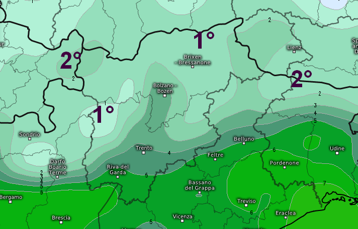 Come vedete siamo attorno ad 1°C a 1500m tra le Alpi lombarde e quelle altoatesine e friulane, segnale dell’inserimento di aria decisamente più fredda, mentre procedendo verso sud l’isoterma di zero gradi risulterà sempre più alto, attestandosi addirittura sui 5°C a livello delle Prealpi.