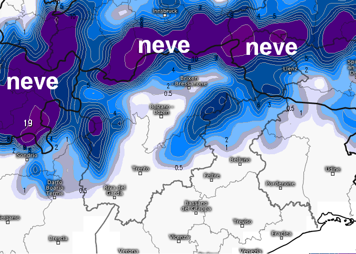I fenomeni nevosi riguarderanno essenzialmente le Alpi piemontesi settentrionali (Ossola), lombarde (alta Valtellina), alto atesine (valli dolomitiche, Senales, Brennero, Aurina), carniche e giulie (alto Tarvisiano, Sella Nevea).