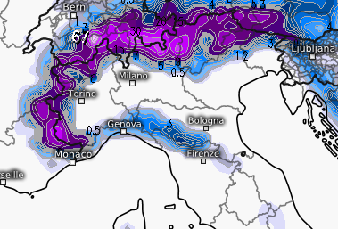 Sebbene non sia prevista neve in pianura, sarebbero tuttavia previsti 5-10cm sull’Appennino settentrionale, tra i 10 e i 20cm lungo le Alpi oltre i 1200m.