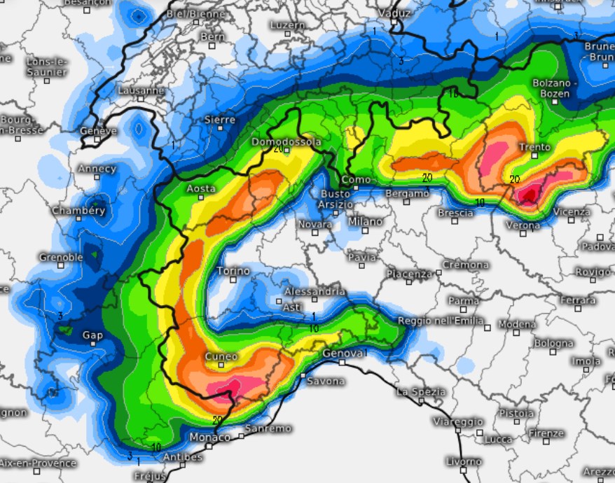 Confermate le nevicate sulle Alpi e Prealpi soprattutto oltre i 1.000-1.200m. Fra il pomeriggio di lunedì e la mattinata di martedì le nevicate potrebbero spingersi fino a 300m sul basso Piemonte e fra Verbano, Novarese e Comasco, con possibili sconfinamenti a tratti fino in pianura fra Astigiano e Cuneese, ma con neve molto bagnata o mista a pioggia e senza accumuli al suolo in pianura. Da martedì un rialzo delle temperature in quota provocherà però un innalzamento della quota neve principalmente su Alpi e Prealpi Torinesi e dell’alto Piemonte, ma che si estenderà successivamente anche al resto dell’arco alpino.