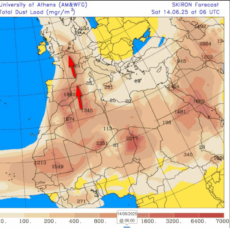 Il fiato rovente dell’anticiclone africano si farà notare tramite la presenza di ingenti quantità di polvere sahariana che interesserà soprattutto l’Europa centro-occidentale ed in parte anche l’Italia. Ecco la stima delle concentrazioni di polvere desertica previste in Europa per le ore centrali di sabato 14 giugno: