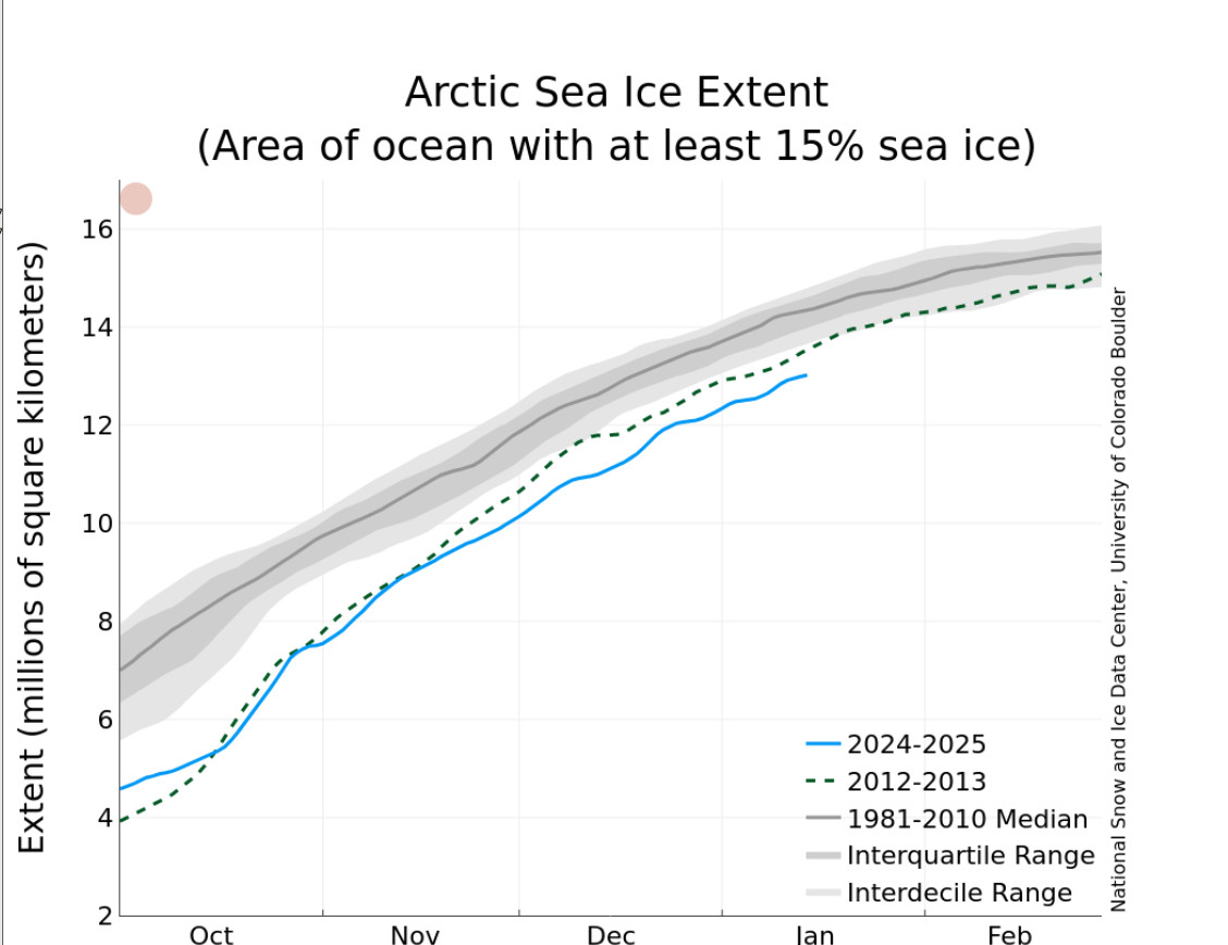 Il secondo diagramma si riferisce all’estensione del ghiaccio in sede ARTICA, sempre dal 2013 ad oggi: