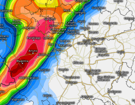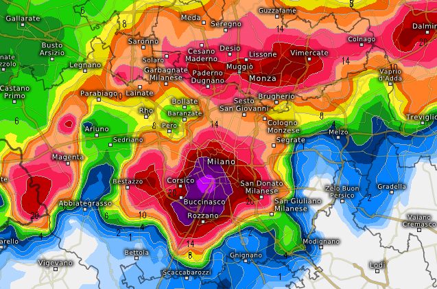Subito dopo il momento culminante della fase perturbata con un peggioramento marcato su tutta l’area del Milanese, con precipitazioni di eccezionale rilevanza secondo il LAM Access, con un altro nucleo in risalita da SW dal Monferrato verso Vigevano e poi a sfondare su Milano, Corsico, Buccinasco, Rozzano, diretto verso Brianza, Lecchese e Comasco.