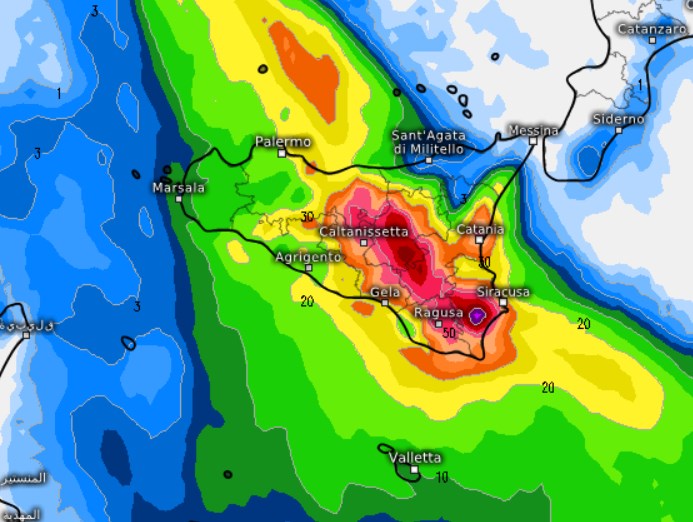 Le piogge si muoveranno da est verso ovest e quelle più abbondanti cadranno fra le province di Caltanissetta, Enna, Ragusa, Catania e Siracusa. Fra Siracusa e Ragusa il modello stima oltre 80mm di pioggia, un quantitatico considerevole. Segnaliamo nevicate abbondanti sull’Etna oltre i 1.600m, dove potranno accumularsi oltre 40-50cm di neve fresca oltre i 2.000-2.300m (sulla sommità del vulcano, a 3.300m, le temperature oscilleranno fra i -7 e i -8°C).