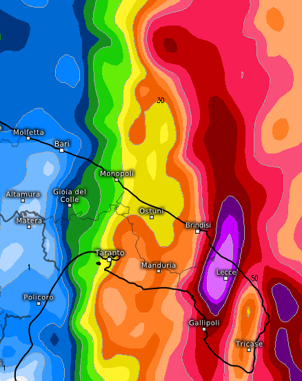 Le aree più colpite potrebbero essere quelle di Lecce e Gallipoli, come mostra la mappa del modello ECMWF: