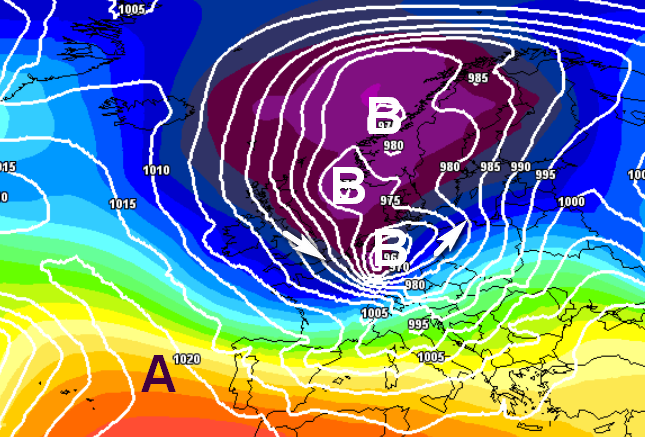 Ecco comunque la carta barica del modello GFS che evidenzia un minimo di ben 965hPa in movimento dalla Francia alla Germania, sino a sfiorare le Alpi, davvero molto pericoloso, per il 21: