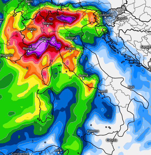 Da notare gli accumuli molto abbondanti anche sull’alta Lombardia, in successivo spostamento su Veneto e basso Trentino, i forti temporali anche su Toscana, Lazio e probabilmente su Sardegna occidentale, anche se gli accumuli più vistosi rimangono quelli della Liguria.