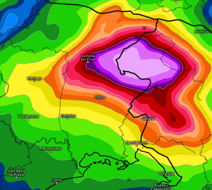 Attenzione anche alle piogge molto abbondanti previste sul Friuli sempre per venerdì: