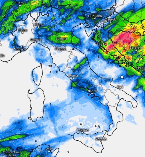 Brevi piogge sparse si dovrebbero verificare su gran parte del nord Italia (tranne sul Piemonte) e fra Lazio e Campania, ma si tratterà di rovesci brevi e poco abbondanti. Intensità un po’ più elevata sull’Emilia Romagna ma assolutamente non in grado di generare criticità.