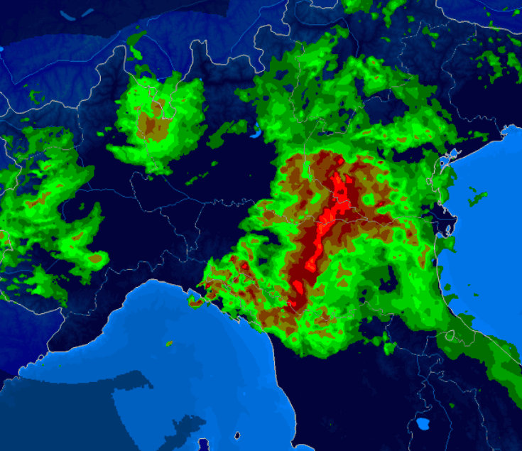 La mappa del radar mostra piogge intense soprattutto tra l’Emilia Romagna e il Veneto:
