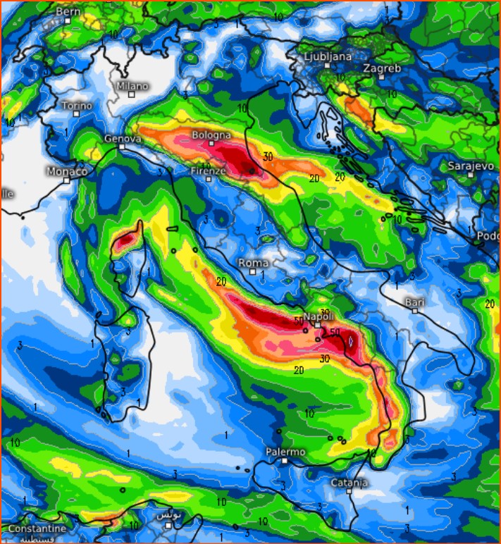 Su entrambe le regioni sono previsti picchi fino a 50mm in 24 ore, un quantitativo considerevole. Pioggia rilevante anche sulla Calabria Tirrenica, anche se con quantitativi probabilmente inferiori a 25mm.