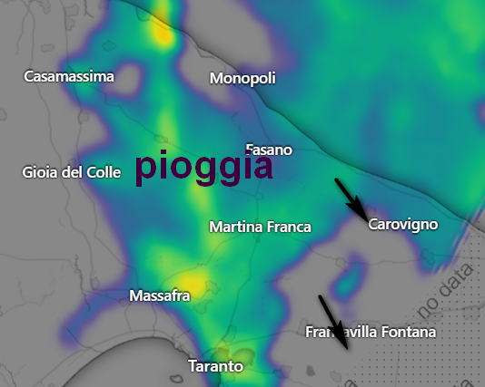 In queste ore piogge moderate ma anche rovesci di forte intensità insistono nel sud della Puglia tra il Barese e il Tarantino e puntano verso il Leccese, in un contesto freddo per la stagione, di chiaro stampo autunnale con temperature che non superano i 13-14°C.