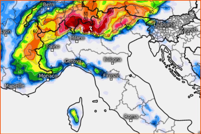 Questa invece è la mappa che mostra le piogge che cadranno entro il tardo pomeriggio del 23 febbraio, accumuli nevosi consistenti su gran parte delle Alpi: