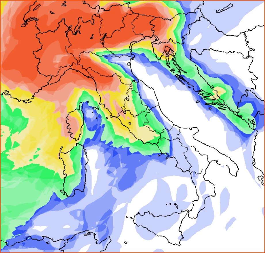 Di seguito la mappa della probabilità di pioggia per la giornata del 23 febbraio, in rosso/arancione la probabilità superiore al 95% (praticamente certa), in giallo 60/70%: