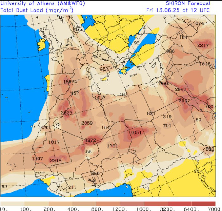 Questa mappa mostra l’arrivo di un consistente carico di sabbia desertica africana che dovrebbe interessare l’Italia nella giornata di venerdì 13 giugno. Tra il fumo degli incendi canadesi e la polvere del deserto, sarà molto difficile vedere cieli limpidi sull’Italia nei prossimi giorni.