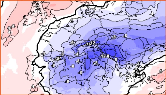 Si notano anomalie fino a -10°C a 1.500m, cioè temperature più basse della norma di 10 gradi a quella quota. Al livello del suolo le anomalie risulterebbero meno marcate ma comunque importanti.