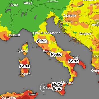 Al nord il rischio è praticamente nullo. Dove vedete il colore giallo il rischio è considerato basso; l’arancione denuncia un rischio di incendi intermedio, il rosso rischio incendi forte e il fucsia molto forte. Come vedete, quasi tutte le regioni meridionali e parte di quelle centrali presentano un forte rischio incendi, che diventa molto forte in Sicilia.