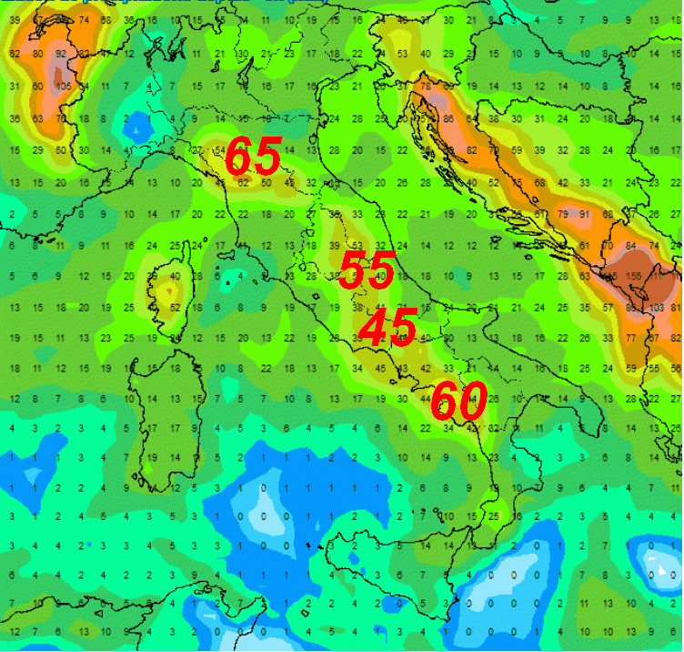 Lo abbiamo chiesto al modello americano che ci mostra la sommatoria delle precipitazioni attese in Italia nell’arco dei prossimi 6 giorni. Notiamo 65 mm sull’Appennino settentrionale, 60 mm tra il Cilento e la Calabria Tirrenica, 55 mm tra Umbria e Marche e 45 mm tra Lazio e Campania. Teniamo presente che si tratta di stime precipitative approssimate che non devono quindi essere prese come oro colato.