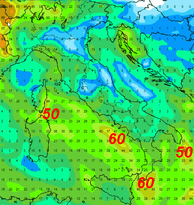 La mappa in questione mostra i millimetri di pioggia attesi in Italia secondo il modello americano per i prossimi 10 giorni. Si tratta solo di stime approssimative, di conseguenza non prendete i valori come oro colato. Secondo il modello di oltre oceano, le aree che riceveranno più pioggia saranno il sud della Calabria (circa 60 mm), la Sardegna nord-orientale e la punta estrema della Puglia (circa 50 mm). Pioverà invece meno o affatto sull’Emilia Romagna, il basso Veneto e parte del medio versante adriatico.