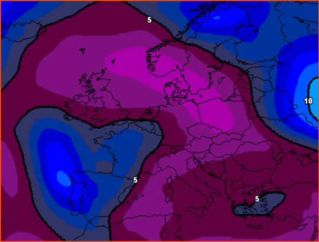La mappa sopra mostra il grado di affidabilità complessiva delle previsioni fino all’11 gennaio. In azzurro/blu la previsione è discretamente affidabile, in violetto è molto affidabile. L’italia si trova nell’area nella quale le previsioni sono molto affidabili, questo significa che è molto probabile che le previsioni dei modelli che stiamo vedendo fino all’11 gennaio si verificheranno effettivamente.