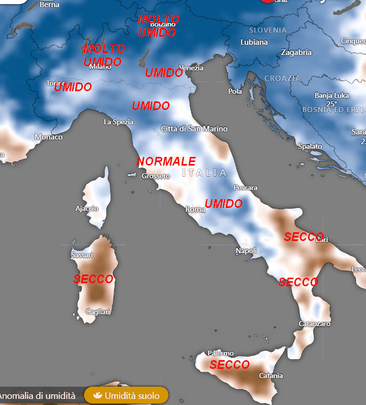 Su alcune zone del nord il terreno è molto umido, anzi, praticamente saturo d’acqua, specie al nord-est. Risulta tra il normale e l’umido al centro, mentre è decisamente secco sulle Isole e molte aree del meridione.