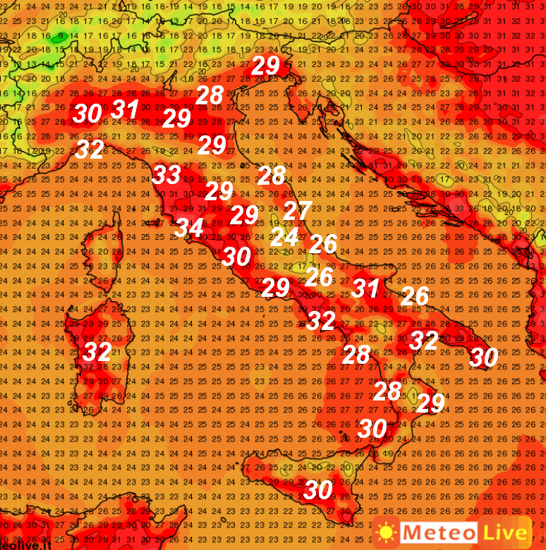 Segnaliamo punte di 34° sulla bassa Toscana, 32-33° lungo le coste liguri, 32° su Sardegna, Campania e Lucania. Valori meno elevati nelle aree interne del centro, sulla Calabria interna e il nord della Sicilia.