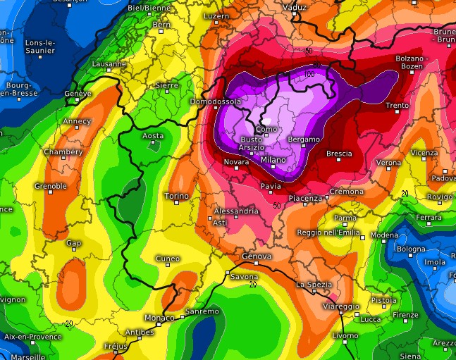 Piogge alluvionali sono previste dal modello GFS per la fine del mese di agosto sul nord Italia, in particolare sull’alta Lombardia. Impressionante gli accumuli previsti per venerdì 29 agosto che, sommati, a quelli dei giorni precedenti, risulterebbero preoccupanti. In sole 24 ore su molte zone cadrebbero oltre 120mm di pioggia, che unitamente a quelli previsti tra martedì 26, mercoledì 27 e giovedì 28 farebbero temere conseguenze piuttosto gravi a livello idrogeologico.