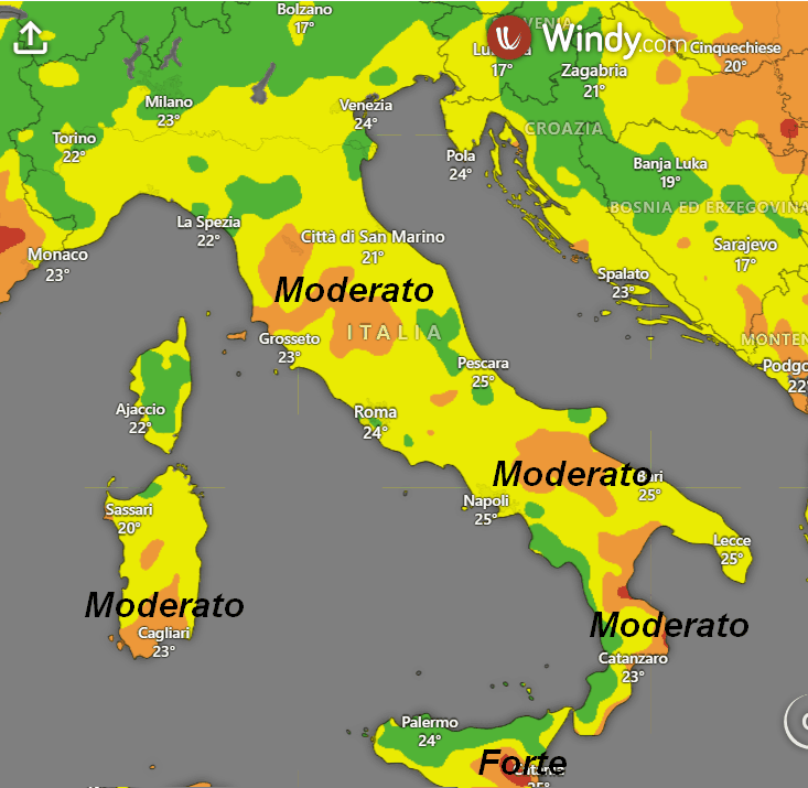 Rischio FORTE su alcune aree della Sicilia, segnatamente nel Catanese. Rischio MODERATO su Sardegna meridionale, Calabria Ionica, Lucania, Puglia e Toscana. Sul resto d’Italia rischio NULLO o DEBOLE (dove vedete il giallo sulla mappa).