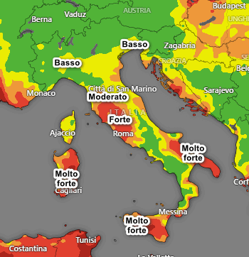Rischio FORTE tra la bassa Toscana e il Lazio, MOLTO FORTE su Sicilia, Sardegna e Puglia.